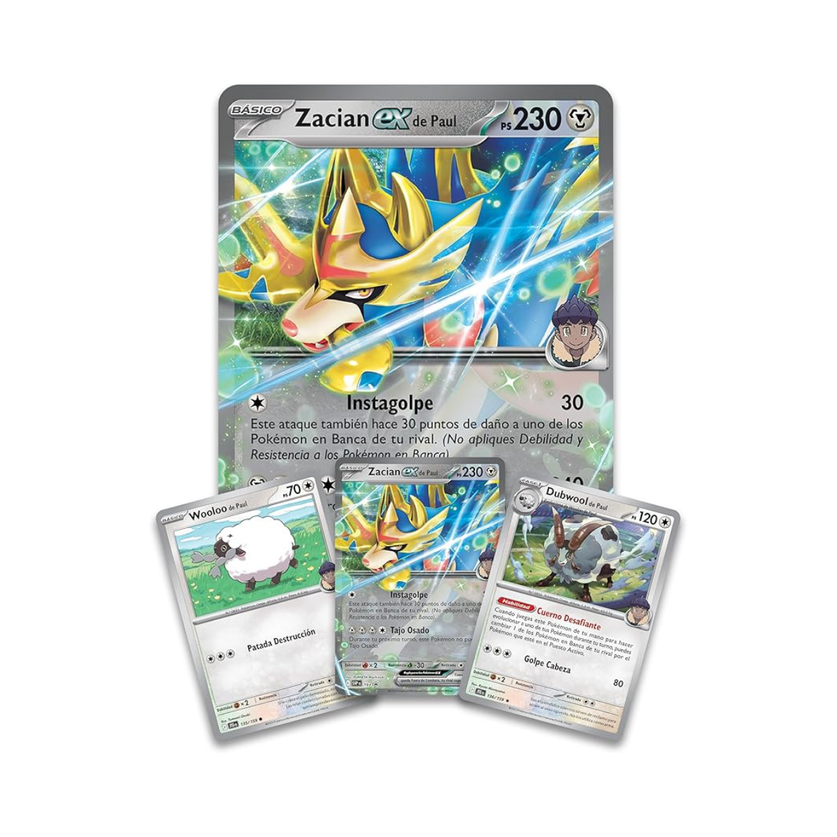¡Dos estrellas de Galar unen sus fuerzas! La Caja Zacian ex de Paul te ofrece una experiencia única con cartas exclusivas y sobres de expansión para potenciar tu mazo y colección.